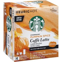 Limited Edition Pumpkin Spice Latte From Starbucks. You Get 2 Boxes, each with 6 kcups and 6 packets. Made with real pumpkin and dairy, naturally flavored, Fits all Keurig