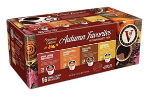 Enjoy the robust flavors of the fall with the Victor Allen Autumn Favorites Coffee Pods Variety Pack. Enjoy Apple-Crumb Donut, Pumpkin Spice, Pecan Pie and Cinnamon Bun specialty flavors