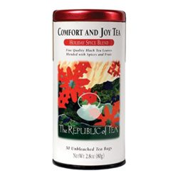 The Republic of Tea’s Comfort and Joy Tea will bring you cheer and good tidings! Flavors of cinnamon, cloves and licorice blended with premium black tea will leave you